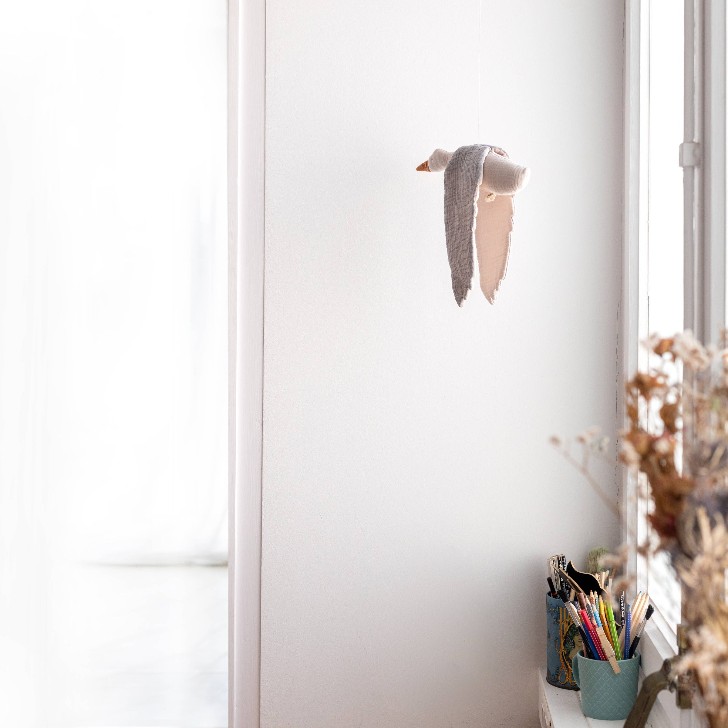 A finely crafted fabric bird to hang in a nursery, child's room, or any corner of the house. A peaceful, gentle nod to the birds in the sky and their patterns of seasonal migration--as well as the comings and goings of the seasons of life.