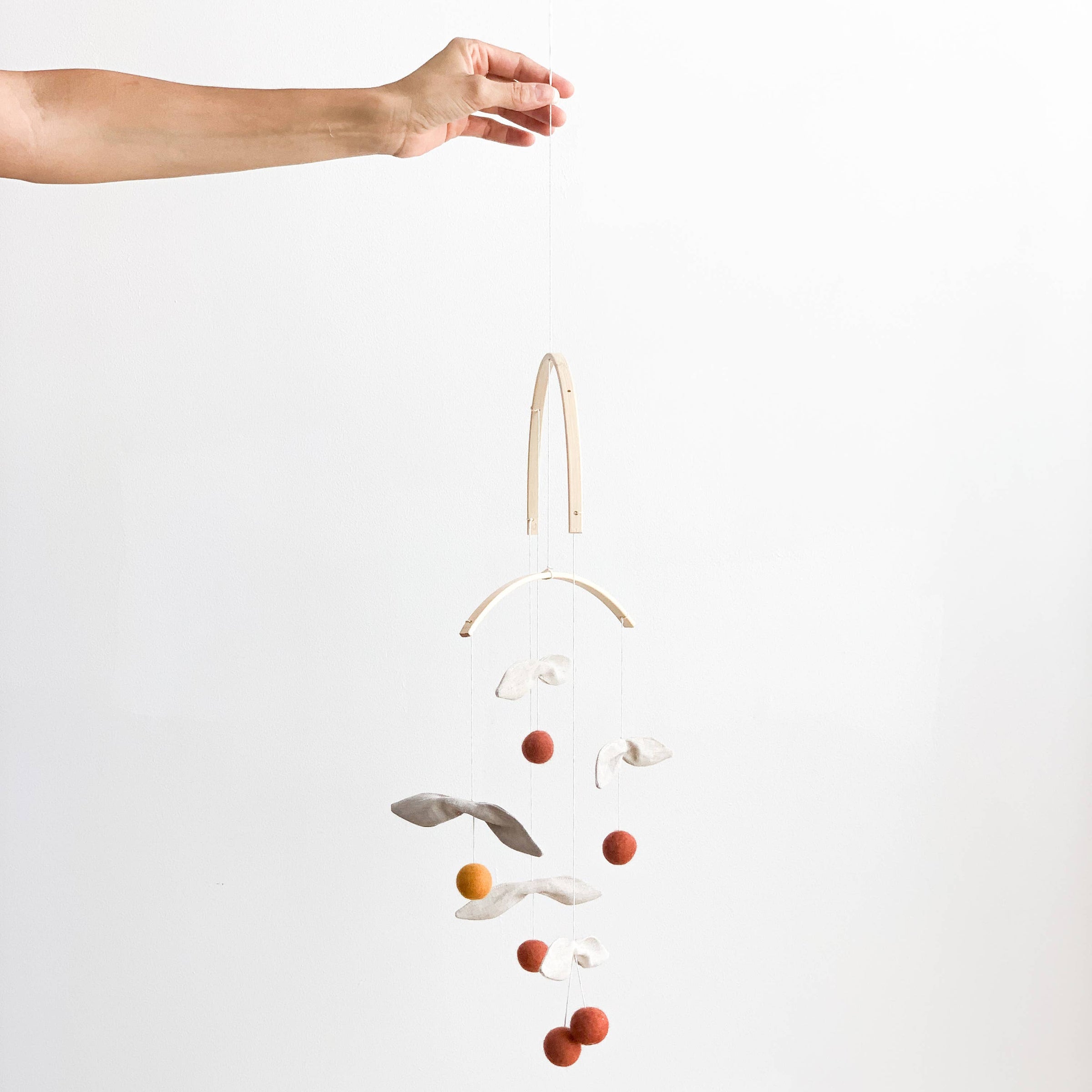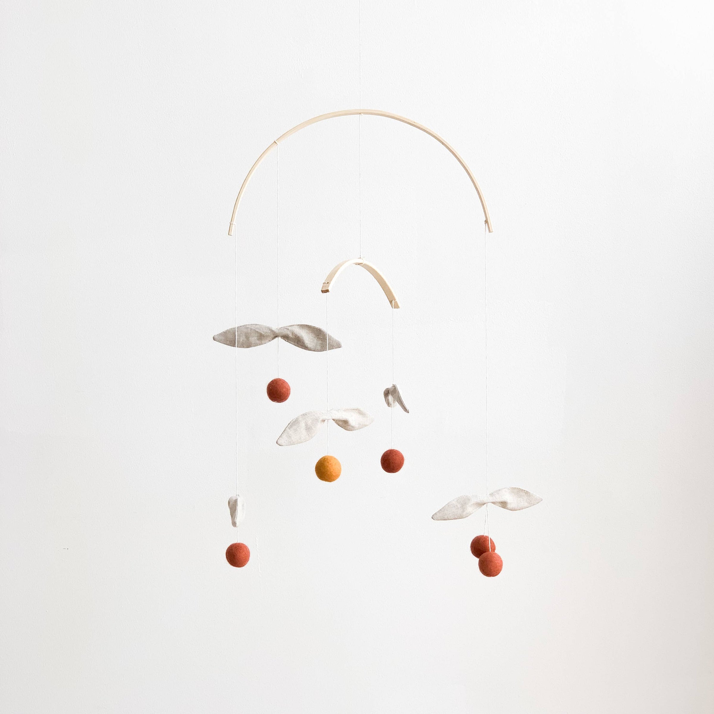 A finely crafted cherry mobile to hang in a nursery, child's room, or any corner of the house. The mass of hand-felted balls and their gentle movement will capture a baby's attention--without over-stimulating--while in the crib or on the changing table.