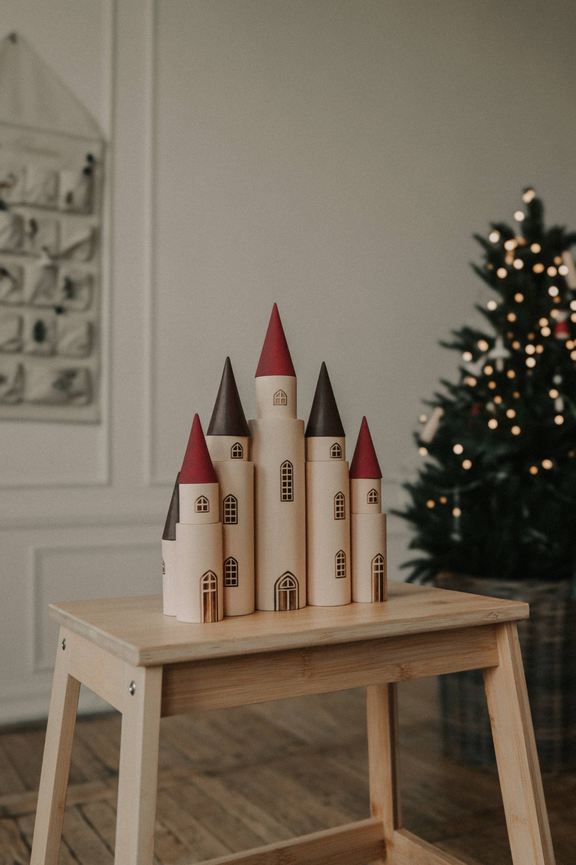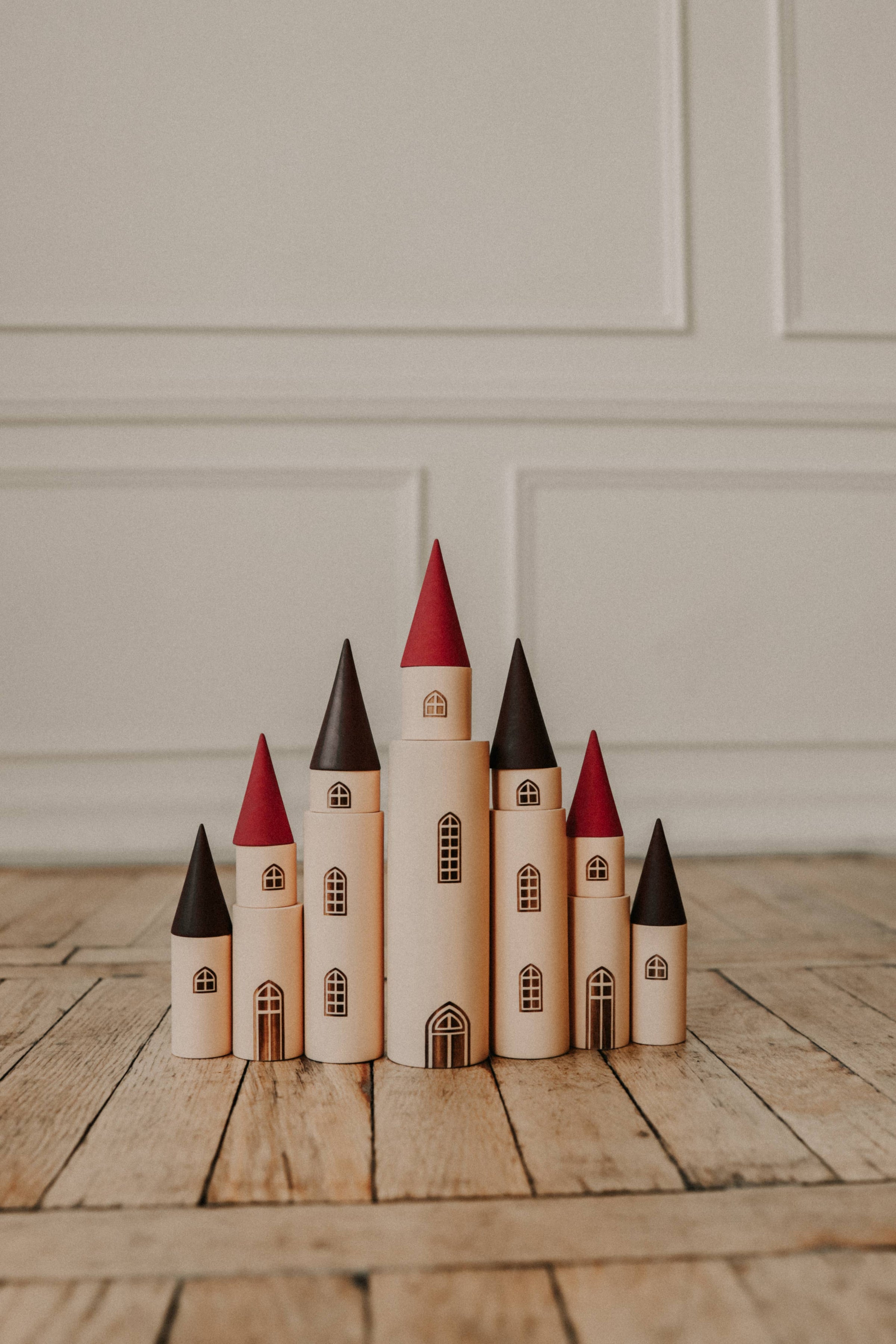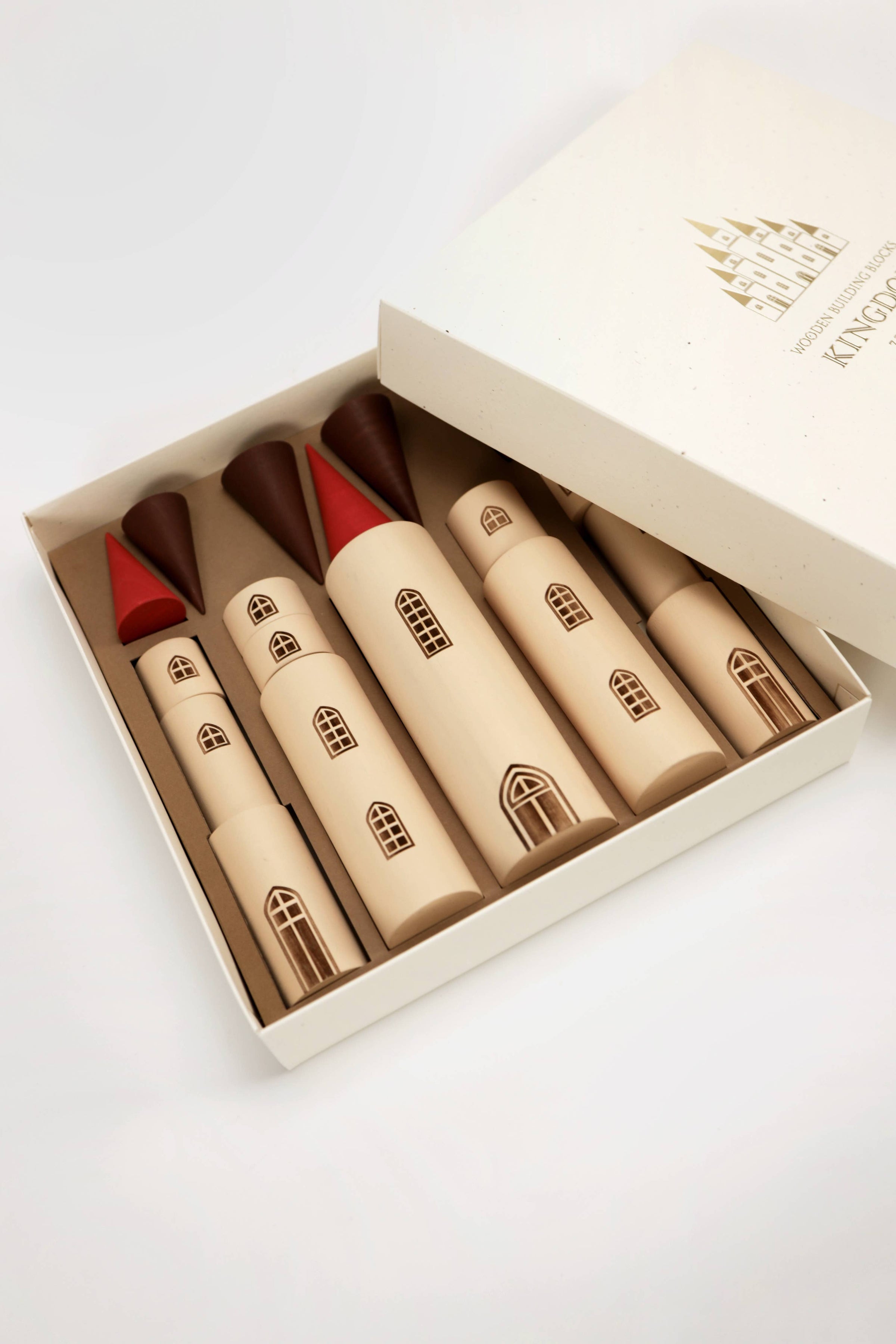 Combine the kingdom blocks with each other in different ways to build a fairytale castle and other imaginative worlds! This delightful set consists of 12 cylinders and and 7 cones in various sizes. Each cylinder has an engraved window and/or door.Handmade from linen wood and water-based paints. Packaged in a gold-plated gift box ready for gifting.