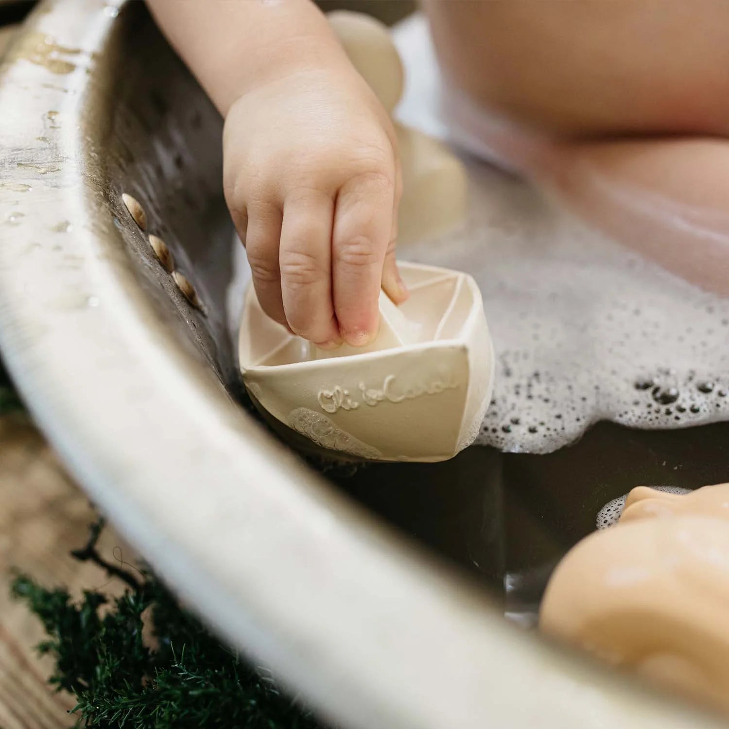 The natural rubber origami boat in white creates endless fun for babies and kids, entertaining them in the tub and wherever else they go. This toy provides worry-free play that stimulates baby's senses and soothes teething gums. A unique add-on to a baby gift, and a perfect stocking stuffer.